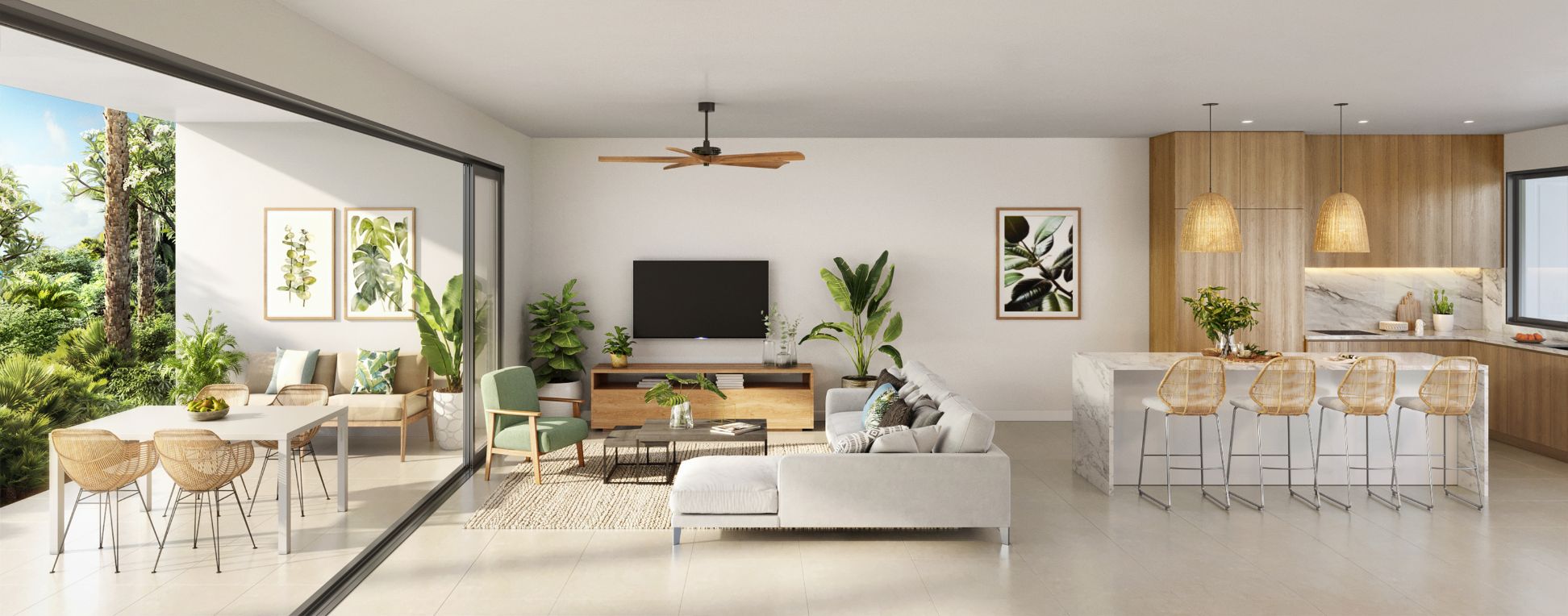2Beach Residences is a chic, modern residential project comprising 24 two-bedroom homes. Designed with a colonial touch, the architecture incorporates slanted roofs. Solid wood and black stone wall cladding are focal points. The luxury residences are on freehold property and accessible to foreigners. Mauritius homeowners have the advantage of exclusive access to the 2Beach Club. These spacious homes offer the perfect beach lifestyle for couples and families. They stretch across three blocks. Layouts for investment apartments and common areas maximize functionality. Their interior decor style will stand the test of time. [pricelist_button button_text="GET THE PRICE LIST NOW" link="https://twofutures.sharepoint.com/:f:/s/docs/EsHjk2JY0f5Gmxcob88DJOYBoFGrxrPayf8_4ENS1HodMA?e=TI9rPk"]
