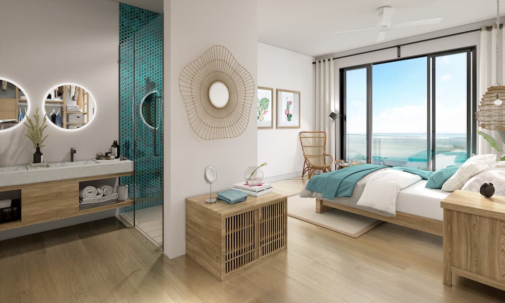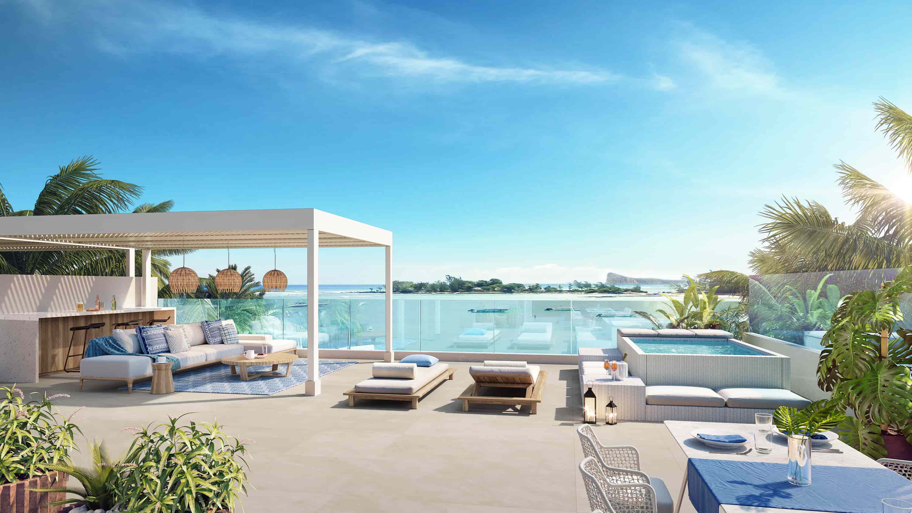Casa Alegria Beachfront – Pereybere will seduce you with the finer things in life. Real estate investors in a luxury beachfront home here get direct access to one of the best stretches of soft sandy beach in the north of Mauritius – Pereybere . Casa Alegria is a G+2 project, a government-approved real estate scheme that enables property development in Mauritius two levels above ground. The penthouses and apartments feature modern design and upmarket finishes. Living areas and en-suite bedrooms are spacious and have large windows to maximise the spectacular views. The penthouses have the added advantage of a rooftop terrace, shaded by a pergola, and a private swimming pool. The interiors of these homes reflect the outdoor inspiration drawn from sky and sea. Look for the flashes of blue in tiles and feature walls, throws and cushions. The world’s most popular colour is everywhere, but subtle, so you never tire of seeing it. This prime beachfront location in Pereybere is within walking distance to shops, restaurants, water sports, and the like. Owners also have exclusive access to the nearby 2Beach Club.